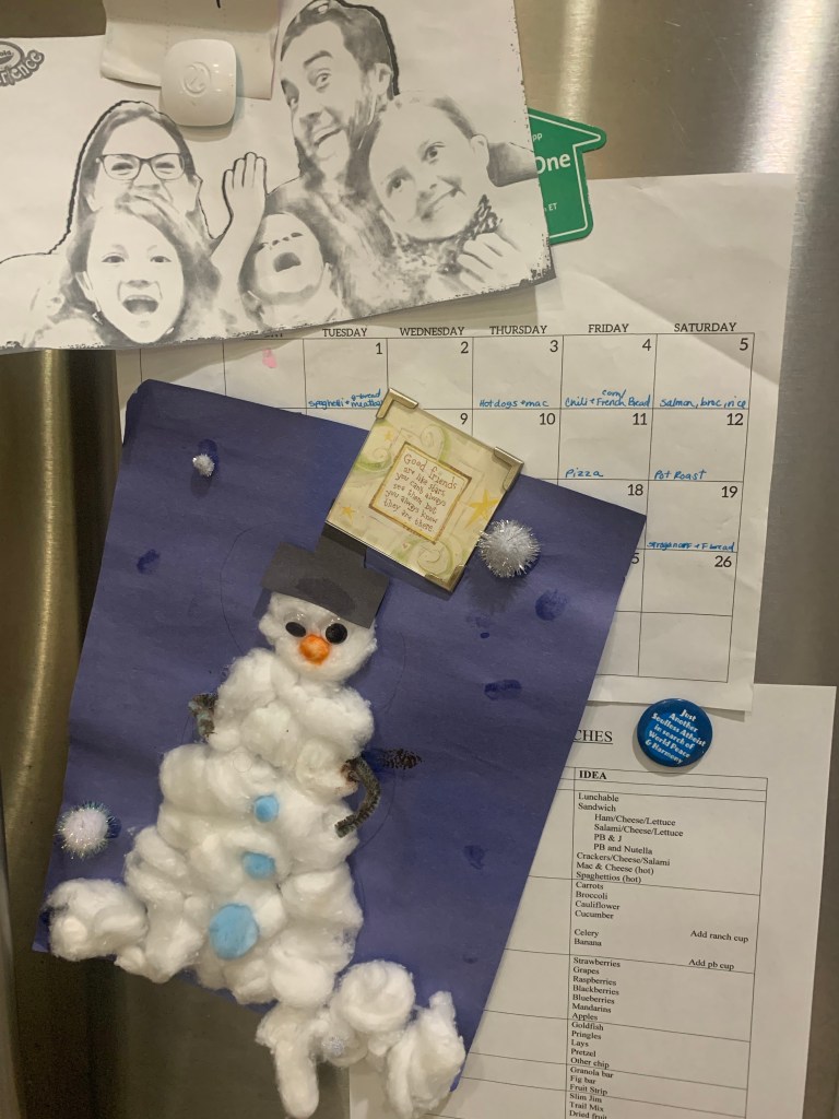 Take the artwork off of the fridge. Take December’s dinner menu down. Take the garland from the top of the cabinets.